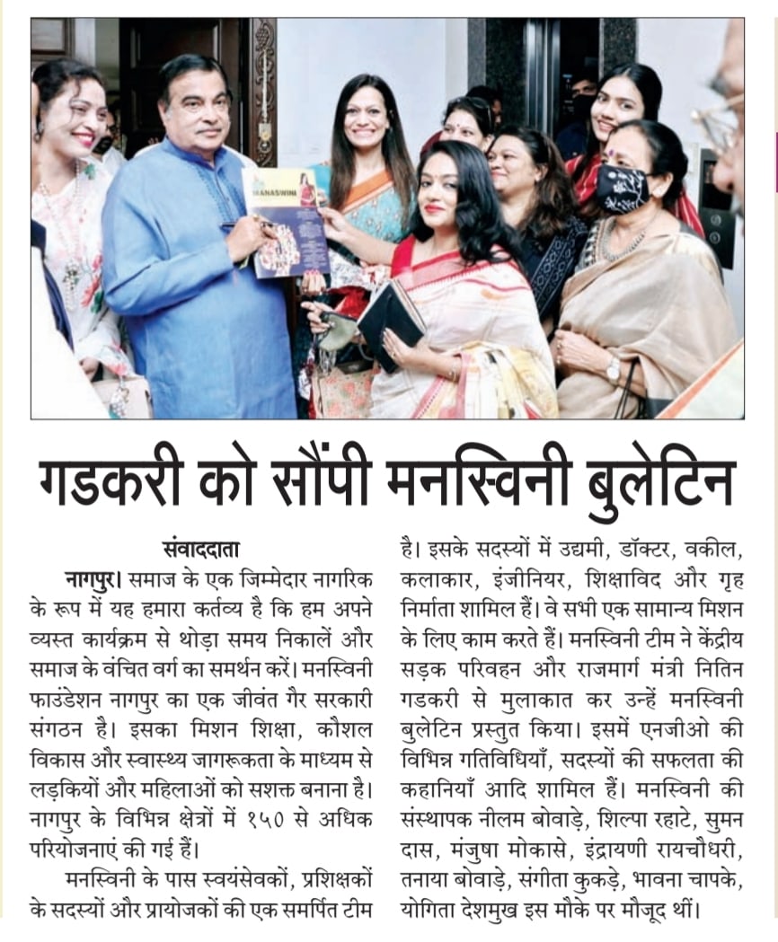 As a responsible citizen of society it's our duty to spare a little time from our busy schedule and support the underprivileged section of society. Manaswini foundation is a vibrant NGO of Nagpur.It's mission is to empower girls & women through education, skill development & health awareness.More than 150 projects have been done in various areas of Nagpur. Manaswini has a dedicated team of volunteers, trainers members & sponsors.Its members consist of entrepreneurs,doctors,lawyers, artists, engineers, educationists & home makers.They all work for a common mission. The team got an opportunity to meet Hon. Mr Nitin Gadkari - Minister of road transport & highways of India & presented Manaswini bulletin to him.It contains the NGO’s various activities, members success stories etc. "We can't help everyone, but everyone can help someone. "Says Neelam Bowade founder Manaswini.